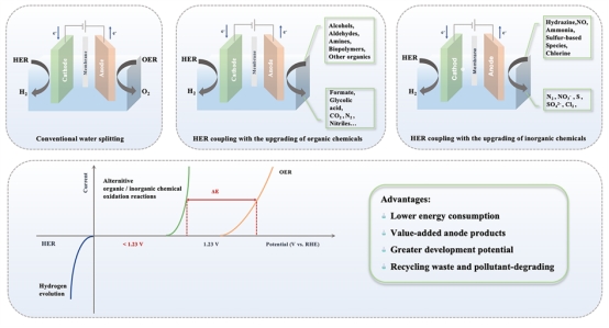 利用可再生能源驱动的电催化水分解技术是生产高纯氢气的绿色途径,但传统电解水过程中,阳极氧析出反应(OER)涉及四电子转移,其动力学缓慢,严重制约整体能效。近年来,用热力学更有利的氧化反应替代OER,并与阴极析氢反应耦合的策略备受关注。该方案不仅能实现节能制氢,还可同步获得高附加值产物或降解污染物。研究者已通过此方法成功实现了多种有机物和无机物的增值转化。