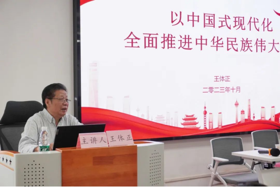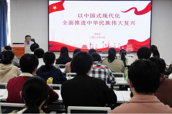 开班仪式结束后,王体正老师为全体学员做题为《以中国式现代化全面推进中华民族伟大复兴》的首场辅导报告,他指出,实现中华民族伟大复兴,是近代以来中国人民的共同梦想,是中国共产党矢志不渝的奋斗目标;阐释了中国式现代化是强国建设、民族复兴的唯一正确道路,并就如何推进中国式现代化行稳致远对广大青年提出了几点期望。