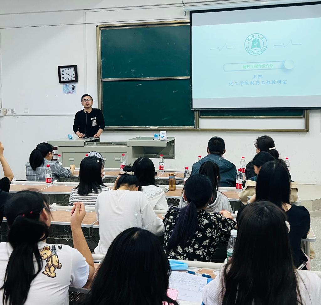 副院长、制药工程系王凯教授首先介绍了我院的对于本科生的教育培养模式:入学第一年接受重基础的通识教育,第二年开始,学生可根据自身职业规划以及学科兴趣进行专业选择。随后,王凯教授向2021级本科生介绍了制药工程这一新兴专业“厚基础、宽口径、重实践”的专业特色。