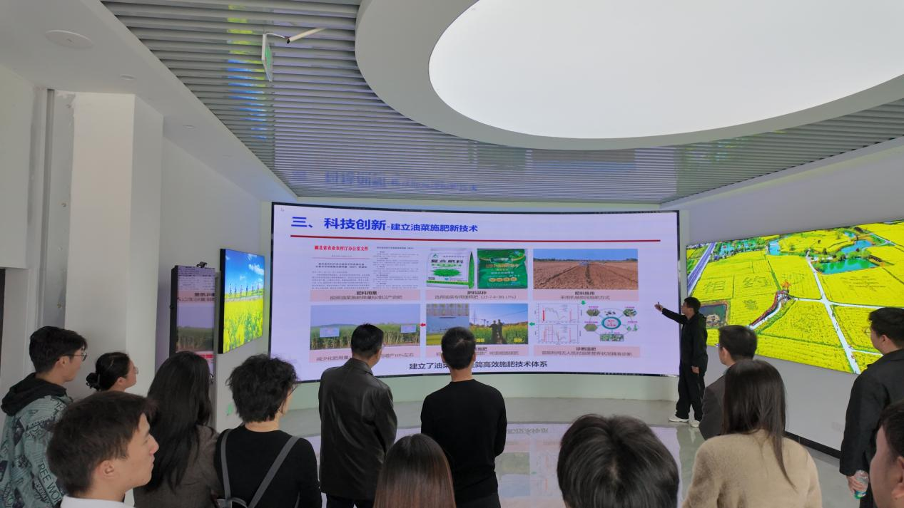 随后,调研组赴沙洋油菜博物馆、曾集镇张池村油菜科技小院和沙洋县人才公寓进行考察。师生们通过丰富的图文资料、实物展陈和多媒体演示,系统学习了沙洋作为“中国油菜之乡”的产业历史脉络与文化积淀。从传统农耕工具到现代产业化成果,博物馆全景式呈现了沙洋油菜从种植、加工到品牌塑造的发展历程,展现出深厚的地域特色和产业文化底蕴。张池村油菜科技小院作为科技服务下沉基层的重要载体,汇聚了农业专家、技术资源和本地农户,形成了“产学研用”紧密结合的服务模式。师生们实地观摩了油菜试验田、绿色种植技术实验室,并与驻点科技人员深入交流,切身感受到科技赋能农业、推动乡村振兴的生动实践。作为吸引和留住青年人才的重要保障工程,沙洋县人才公寓人才公寓设施齐全、环境舒适,配套服务完善,参观师生纷纷表示感受到了沙洋县对高层次人才和青年创业者的重视与支持。