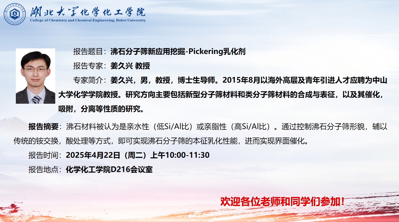专家简介:姜久兴,男,教授,博士生导师。2015年8月以海外高层及青年引进人才应聘为中山大学化学学院教授。研究方向主要包括新型分子筛材料和类分子筛材料的合成与表征,以及其催化,吸附,分离等性质的研究。