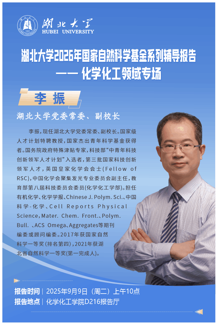李振,现任伟德国际1946党委常委、副校长。国家级人才计划特聘教授,国家杰出青年科学基金获得者。国务院政府特殊津贴专家,科技部“中青年科技创新领军人才计划”入选者,第三批国家科技创新领军人才,英国皇家化学会会士(Fellow ofRSC),中国化学会聚集发光专业委员会副主任,教育部第八届科技委员会委员(化学化工学部)。担任有机化学、化学学报、Chinese J.Polym.Sci.、中国科学-化学、Cell Reports PhysicalScience,Mater.Chem.Front.、Polym.Bull.、ACS omega、Aggregates等期刊编委或顾问编委。2017年获国家自然科学一等奖(排名第四),2021年获湖北省自然科学一等奖(第一完成人)。
